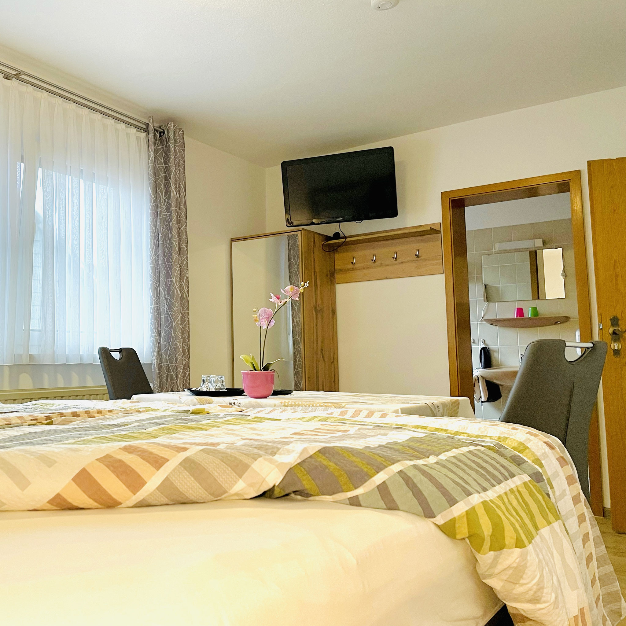 Unsere freundlich eingerichteten Gästezimmer wurden 2021 grundrenoviert und sind alle mit DU/WC, Sat-TV und Tresor ausgestattet.