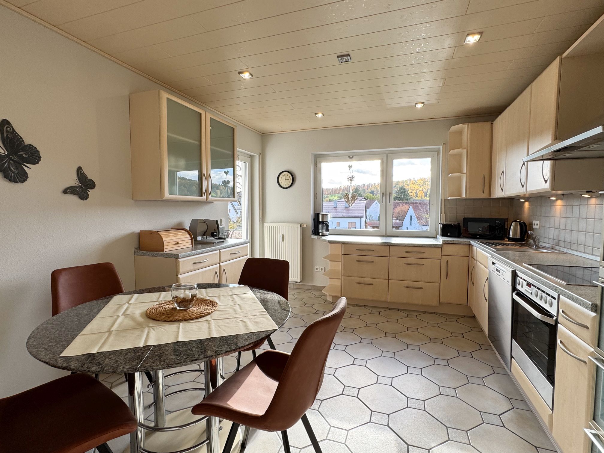 Die Küche wurde im „Landhaus-Stil“ erstellt und beinhaltet so ziemlich alles was benötigt wird.Von hier aus gelangen Sie auf den kleinen Balkon mit unverbautem Blick über das Jossatal.
