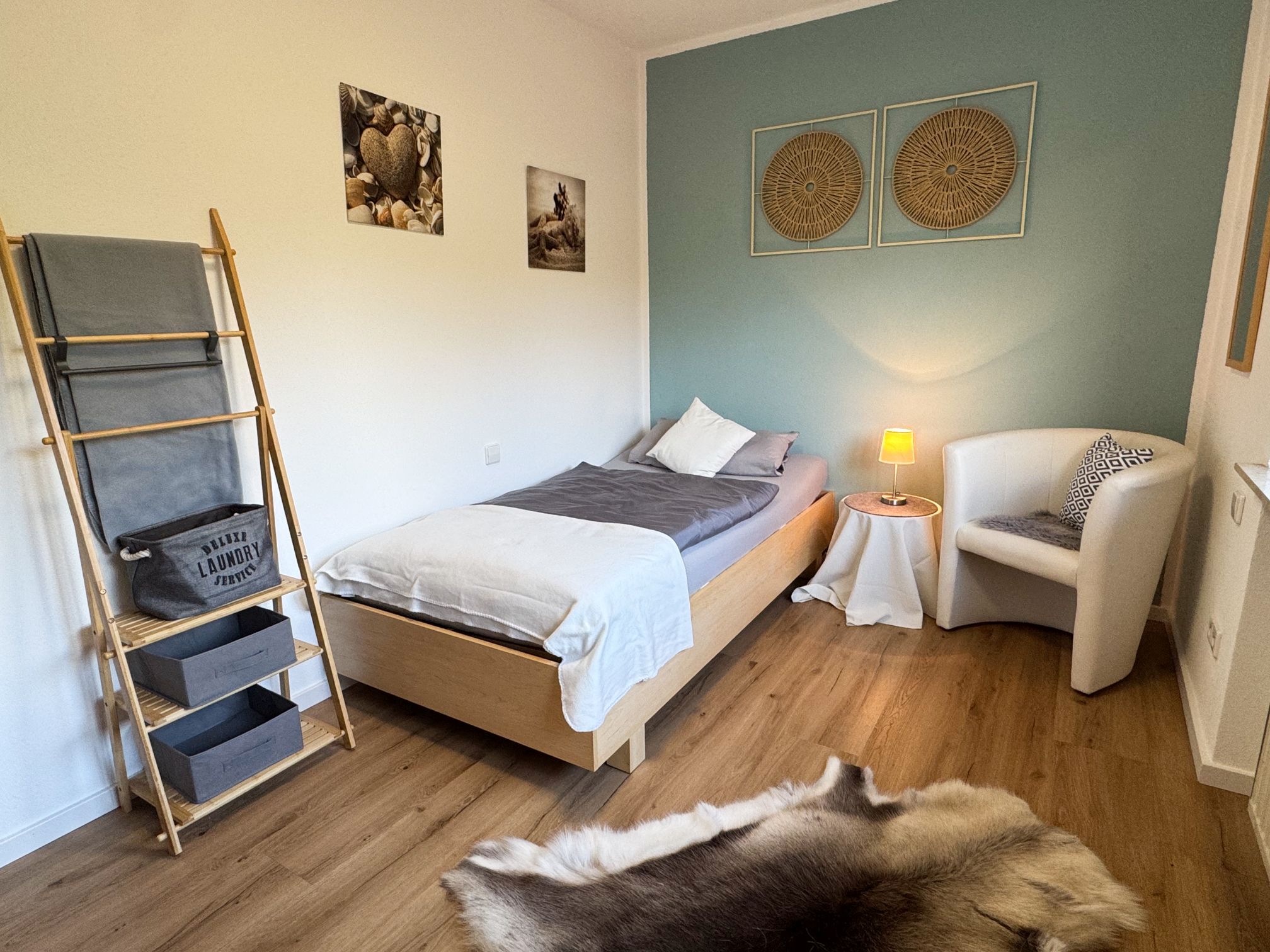 Die kürzlich renovierte Ferienwohnung (Nichtraucher) befindet sich in einem freistehenden Haus mit Jugendstil Flair. Die Wohnung liegt im Erdgeschoss des Objektes und hat eine Fläche von ca. 70m². Das Wohnzimmer ist unterteilt in einen romantischen sowie einen Retro-Bereich. Der Retro-Bereich ist im „US Dinner-Stil“ der 50er Jahre eingerichtet und bietet Dinner-Sitzmöbel sowie eine Jukebox die sie sicher in die Vergangenheit reisen lässt.